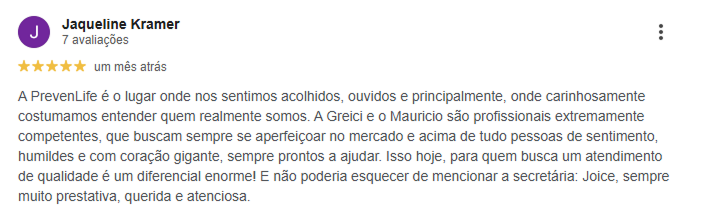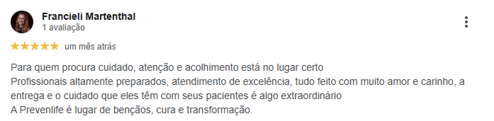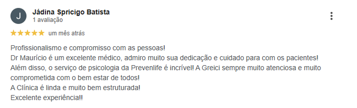 A maior prova da nossa dedicação está na experiência de quem confia na Prevenlife. Veja o que alguns pacientes dizem sobre o nosso atendimento: